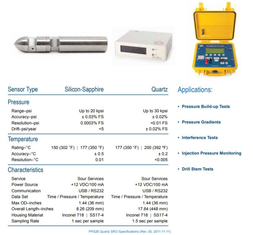The PPS26 Surface Readout (SRO) Gauge is designed for real time sampling of pressure and temperature data for applications focused on production optimization, well stimulation or reservoir development. Due to the gauge’s stability and strong transmission distance, the PPS26 can send data from downhole to surface through one single conductor wireline cable at well depths up to 7,000